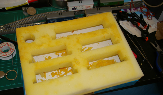 Az alapformának semmi baja, míg az alsó szivacslap teljesen szétporladt. Rossz anyagminőség, netán a modell olajozása "ette meg" az egyébként azonos összetevőkből készült habot, nem tudom, de mindenképp nagy bosszúságot okoz egy 25 éves modell reaktiválásakor.