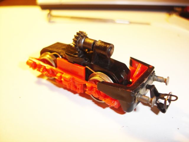 Az első próbakör nagyon keservesre sikeredett. Úgy viselkedett a mozdony, mintha nem kapna stabil tápfeszültséget. Mi lehetett az ok? Ha kicsit lenyomtam a mozdonyt a sínre, akkor nekiindult. Újból szétkaptam és rájöttem, hogy a képen látható áramszedő drótok nem feszültek eléggé a főkereten végigfutó rézlap alsó füleihez. Ez a rézlap szedi fel a kerekekről érkező áramot, majd a kaszniban helyet foglaló panel csatlakozófülei révén továbbítják a motorhoz. Egy apró hajlítás után máris tökéletes lett a kontaktus. Az egy kör szikrázó nyomai azonnal láthatók a frissen tisztított rézlapon.