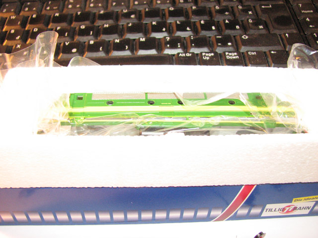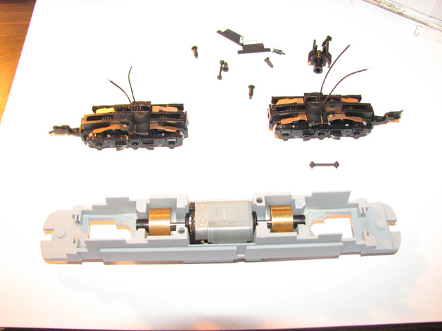 A mellékelt, meglehetősen igénytelen kartondobozban pedig ott volt az összes apróság: a két forgóváz-fél, a palástjuk darabokban, az összes fogaskerék, kardánok, áttételházak, áramszedőlemezek, kerekek, gumigyűrűk külön. A motor a rászerelt két lendítősúllyal, valamint a vezérállást imitáló, fekete kupak. Összerakási leírás nincs a dobozban, pedig a megszokott modellkísérő, ismertető mellett elférne.