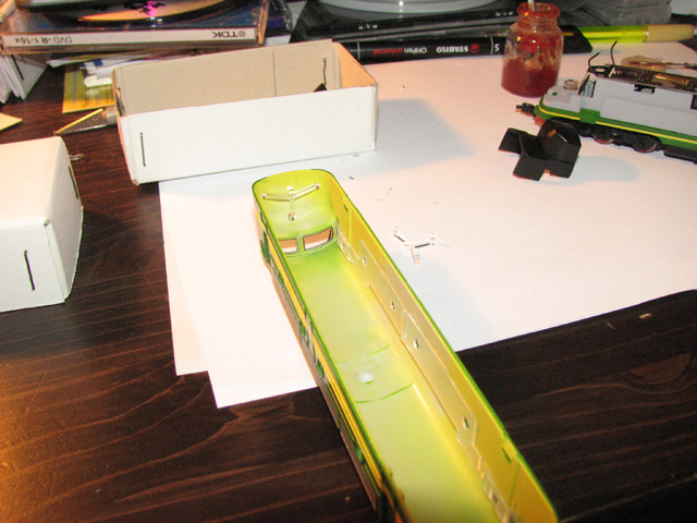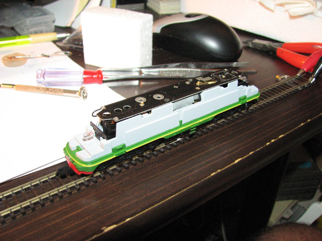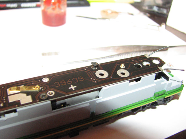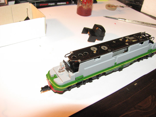 A panel két végén gyárilag ott van a rizsszemizzó. Mivel a Nohab modellnek nincs zárfénye és a főfény is hagyományos izzó, így sok dolgunk nincs, csak óvatosan a helyére kell hajlítani az égőt. Javasolt egy helyes fogóval a kívánt szögbe hajlítani a drótot. Az izzó mögött látható T alakú műanyag lapka is külön volt. Ennek az a feladata, hogy ne engedje be az izzó fényét a géptérbe. A következő lépésnél bekerülő "vezérállás-sapka" nagyon passzentos ezzel a lapkával, ezért figyelni kell az izzó beállításánál.